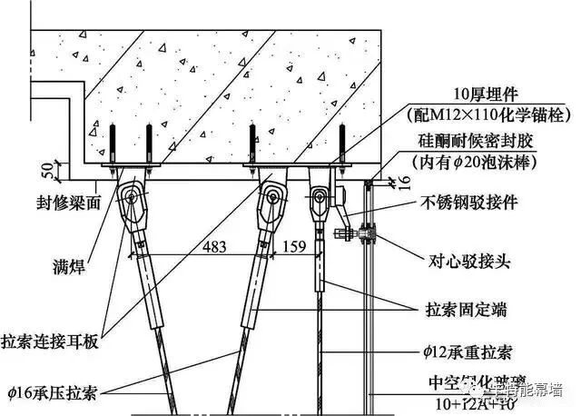 幕墙构造设计直接关系到幕墙质量、安全和使用功能。设计时应考虑点支承玻璃幕墙的面板与支承结构的连接,靠驳接头和驳接爪,玻璃上打孔、驳接头构造及驳接头与驳接爪连接构造、驳接爪构造等设计应从有利于简洁传力,避免应力集中有利于防止雨水渗漏和空气渗漏;有利于安装及消除安装偏差和温度变形的调整原则,达到幕墙安全、适用、满足功能要求。对于可能产生冷凝水(结露)的部位、应设泄水通道,便于排除。